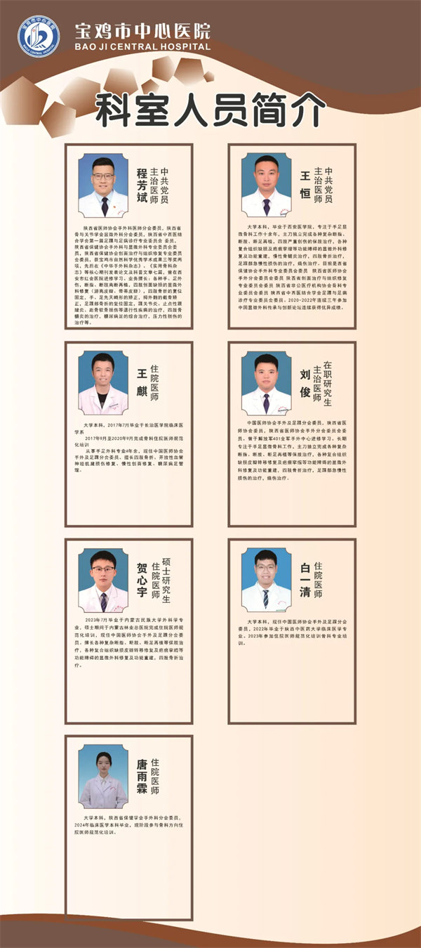 宝鸡市中心医院手足、显微骨科,是集医疗、科研、教学为一体的陕西省临床重点专科、宝鸡市医学会手外科分会主委科室。最早在宝鸡地区开展断指再植,手指再造、皮瓣移植治疗四肢严重损伤后组织缺损、带血管骨移植治疗股骨头坏死等疑难骨病,综合实力达到国内先进水平。科室坚持以质量求生存,以创新求发展的服务理念,秉承精益求精的作风完成每例手术,以更好的恢复患肢(指)外形及功能。“孜孜以求、精益求精、永不言败"是每个医护人员的格言。目前,科室分为姜谭院区和港务院区两个病区。设置手外科、足踝外科、骨显微外科、慢性创面修复外科等亚专业小组,近几年来,与多科室协同开展的头颈面部创面修复填补了宝鸡地区空白、达到国内先进水平。现有医生14人,主任医师1人,副主任医师4人,主治医师5人,住院医师4人。
