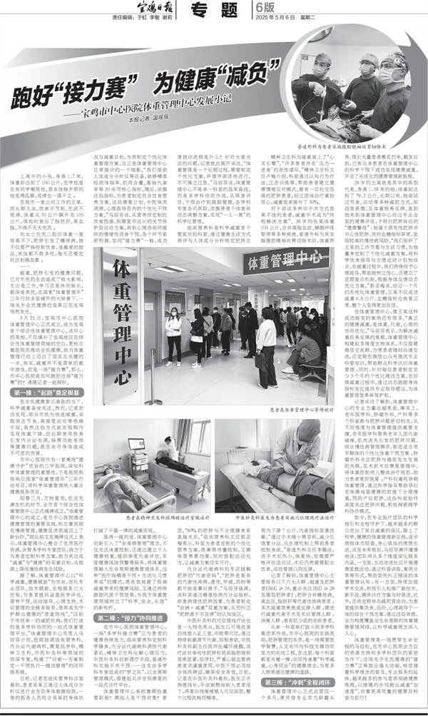 3月25日,宝鸡市中心医院体重管理中心正式成立,成为宝鸡首个综合性体重管理中心。该中心的亮相,不仅填补了宝鸡地区在综合性体重管理领域的空白,更标志着医院在推动全民健康、助力体重管理行动上迈出了坚实且关键的一步。其实,减重并不是简单的数字游戏,而是一场“接力赛”。那么,市中心医院是如何跑好这场“接力赛”的?请随记者一起探析。