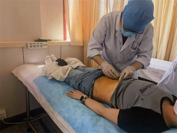 中医针灸科医生为患者实施穴位埋线疗法治疗